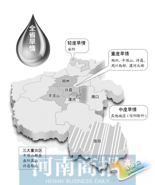 目前除信阳外,郑州、平顶山、许昌、周口西部、漯河北部都出现了重度旱情,其他大部分地区为中度旱情,安阳为轻度旱情。