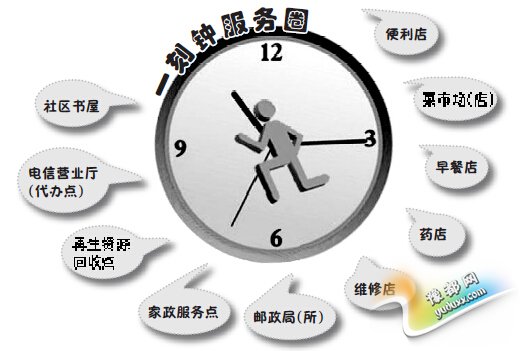 社区中将有便利店、菜市场、早餐店、药店、维修店、邮政局(所)、家政服务点、再生资源回收点、电信营业厅(代办点)、社区书屋10个商业网点,打造一刻钟便民服务圈;各地政府要出资购买一部分商业用房,用于居民生活必需的商业设施建设。