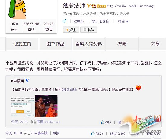 中原网讯(记者 殷海涛 实习生 李佩艳)2014年夏天,河南遭遇63年来最严重的一次“夏旱”,近74万人饮水困难。8月7日,微博女王姚晨、延参法师心系河南,为大旱捐款。延参大师更是调侃自己不仅长得难看,还没祈雨的能耐,被网友赞“萌萌哒”。