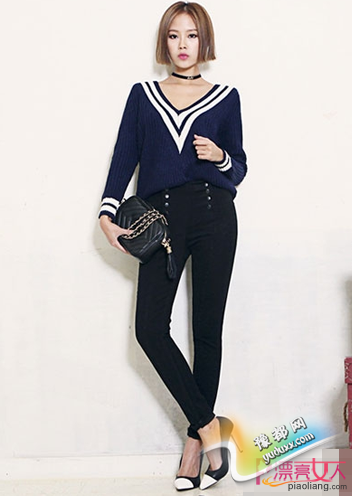 藏蓝色毛衣不管是单穿还是内搭都很显气质,大V领设计秀出性感锁骨,视觉上更加显瘦,还运用了白色条纹做点缀,有种清新学院风的感觉,配黑色紧身裤和黑白拼接的高跟鞋,干练大方有女人味。