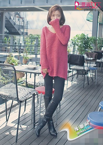 玫粉色毛衣既有小女生的甜美感,又有小女人的妩媚味道,靓丽的颜色很衬肤色,V领设计秀出锁骨和白皙肌肤,柔美而诱人。毛衣是宽松版型,透着慵懒随意的味道,下面配黑色紧身裤和长筒靴,时尚不失帅气。
