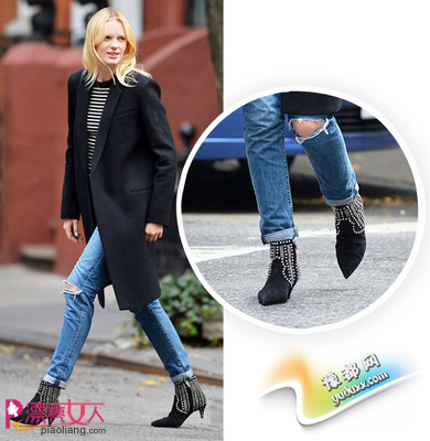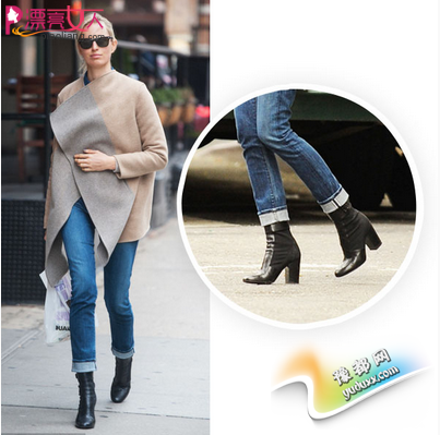 粗跟窄口短靴简约实穿,又能突显你纤细的脚踝,特别适合与普通版型的基本款仔裤组合(非宽版也非窄口),只要像Karolina Kurkova 这样将裤边整齐卷起,上身搭配简约的中长外套就非常完美了。