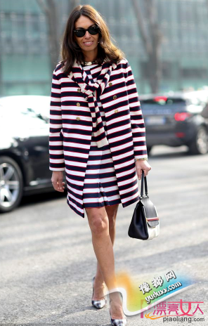 海军风十足的红蓝白条纹一直是永不过时的经典图案,大衣内搭同色系的连衣裙个性十足。