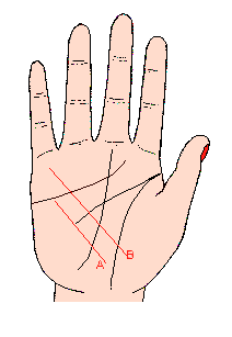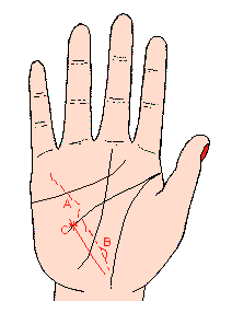 如果有这条线,则以劲而有力,成一直线为最理想,主健康活力强,在性的方面也颇有魅力,同时生活也很稳定;相反地如果这条线没有气力,又断断续续的话,表示身体衰弱,也失去性的魅力,健康线应以下端不碰到生命线为真健康(记号A),如果健康线越过生命线,表示内脏尤其循环器之衰弱(记号B)。