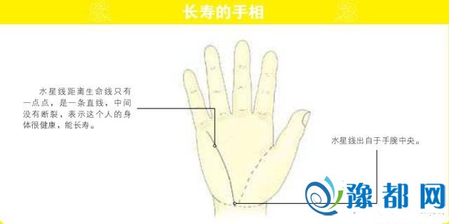如果水星线距离生命线只有一点点,是一条直线,中间没有断裂,表示这个人的身体很健康,消化、呼吸器官状况都不错,可以说这种手相就是长寿的手相。但是如果有这种手相的人自认为健康状况极佳,不注意保养,还是会对健康造成损害,所以即使是手相极好的人也要注意养生方面的问题。