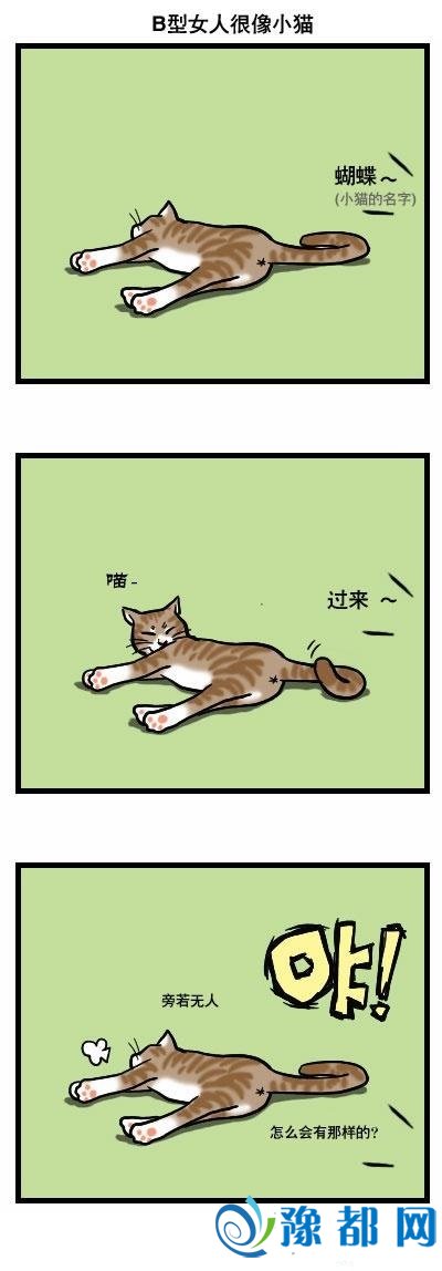 是不是感觉和你周围B型血的女性朋友很像呢?一只慵懒的小猫,对着什么都熟视无睹,一心就想着自己如何舒服。漫画是不是很传神呢?
